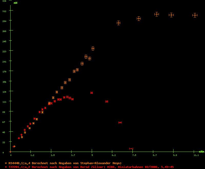 Die in diesem Abschnitt genannten Leistungen sind die abgegebenen Leistungen, welche Modelle beim Bewegen der angehängten Züge abgeben. Diese sind das Produkt aus angehängter Zugmasse und der Geschwindigkeit in m/s (ohne Maßstabsumrechnung). Zur Bestimmung eines Leistungsdiagramms ist ein hoher Aufwand notwendig, da jedes angehängte Modell lauftechnisch überprüft und vermessen werden muß. Nur dann läßt die angehängte Zugmasse einigermaßen reproduzierbar angeben. Alternativ kann man auch die Zugmasse interpolieren, indem man einen Bruchteil vom Maximum nimmt, daraus die Drehzahl berechnet (dies geht vor allem bei Gleichstrommotoren leicht) und das Produkt bildet. Im folgenden Diagramm sind zwei Beispiele aufgetragen.
